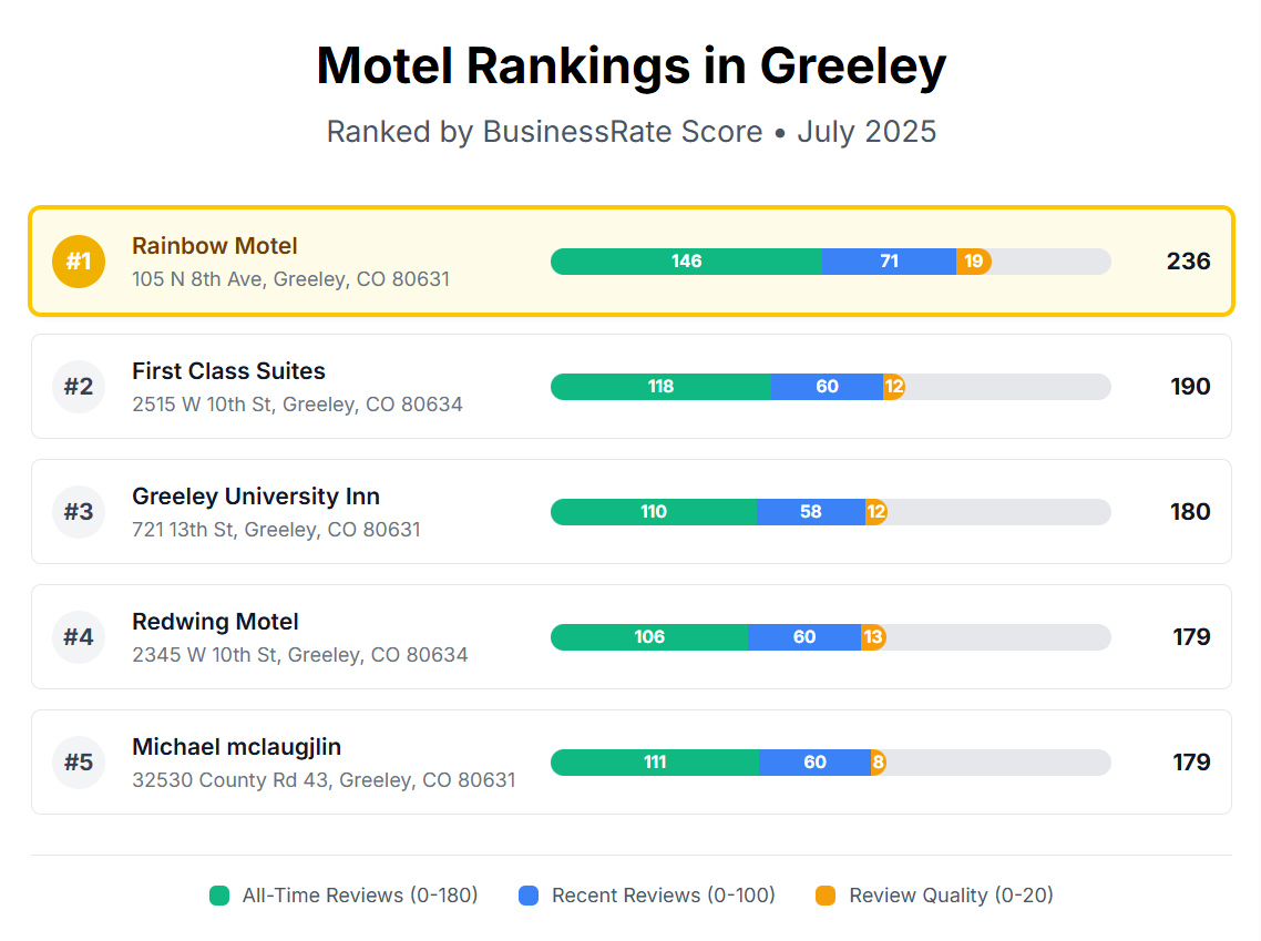 Google Ratings has ranked the Rainbow Motel as the TOP MOTEL in Greeley, Colorado. Customers responses show the Rainbow delivers the top guest experience in the city, according to reviews tracked by Google.